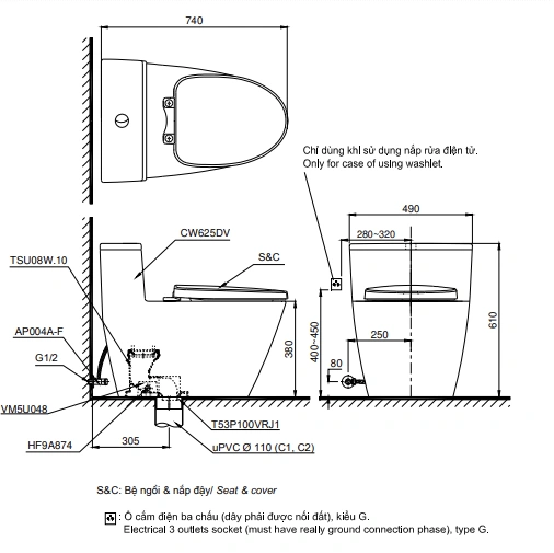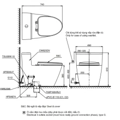Tâm xả (Rough‑in): 305 mm — tương thích với tiêu chuẩn thoát nước phổ biến tại Việt Nam