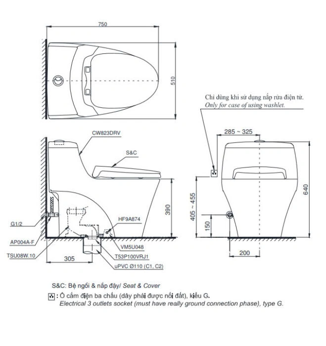Thiết kế chiều cao và kích thước tiêu chuẩn giúp người dùng ngồi thoải mái trong quá trình sử dụng. Với tâm xả 305mm, bồn cầu dễ dàng lắp đặt tại hầu hết các công trình từ nhà phố, chung cư đến biệt thự hoặc khách sạn.