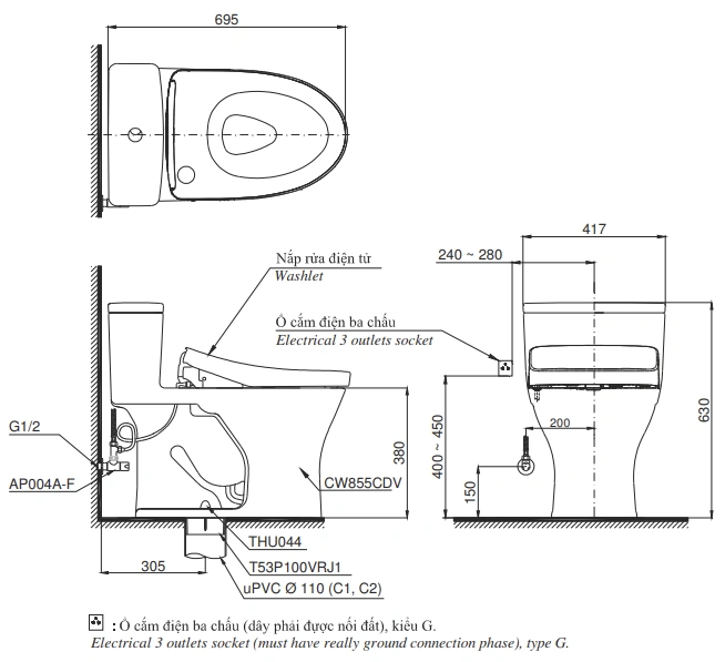 Với thiết kế liền khối chắc chắn và tâm xả tiêu chuẩn 305mm, MS855CDW23 phù hợp với hầu hết hệ thống ống thoát sàn hiện nay. Sản phẩm hoạt động ổn định trong dải áp lực nước rộng, dễ lắp đặt và bảo trì. Nguồn điện sử dụng cho Washlet là 220V – phù hợp với tiêu chuẩn Việt Nam.