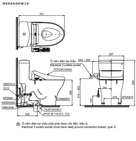 MS889DRW16 sử dụng xả hai chế độ (4.8L/3.0L) – vừa tiết kiệm nước lại vừa đảm bảo hiệu quả làm sạch tối ưu, phù hợp với xu hướng tiêu dùng thông minh và bền vững.