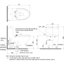 Xuất xứ & Phụ kiện: Thân cầu sản xuất tại Việt Nam, nắp TCW1211A nhập khẩu từ Malaysia; sản phẩm đi kèm van dừng, bích nối sàn, gioăng cố định đầy đủ; bảo hành 24 tháng chính hãng.