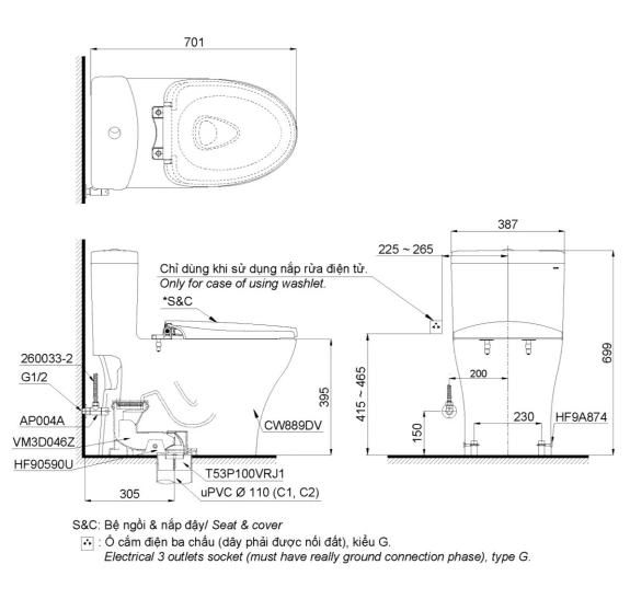 Tâm xả (rough‑in): 305 mm – tiêu chuẩn lắp đặt quốc tế phổ biến tại Việt Nam.