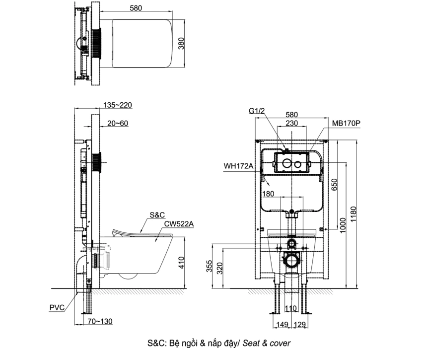 8. Bản vẽ kỹ thuật 2D bồn cầu treo tường CW522EA/TCF797C2Z/WH172AAT/MB171M#SS