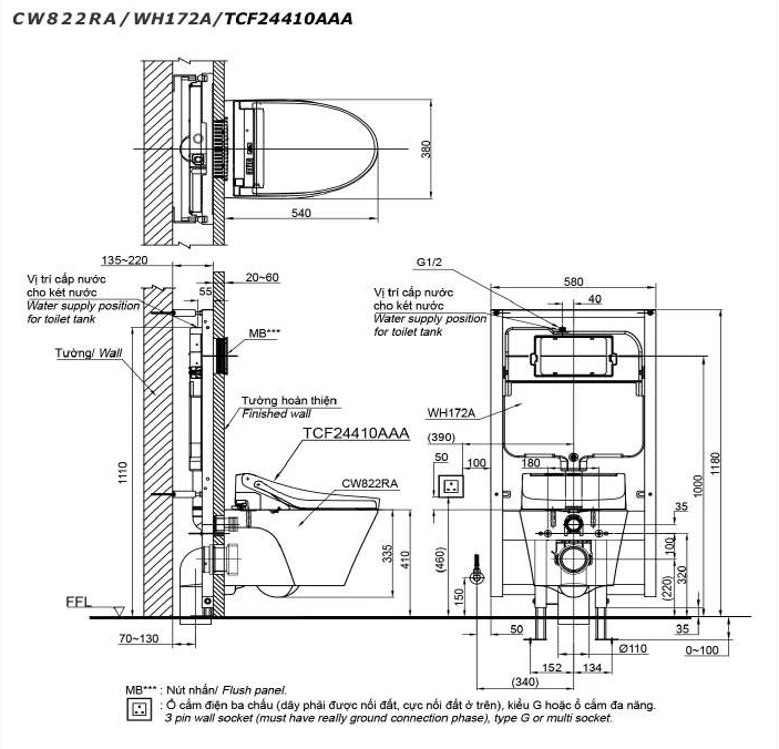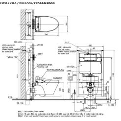 6. Bản vẽ kỹ thuật 2D bồn cầu treo tường CW822RA/WH172A/TCF24410AAA/MB170P#SS