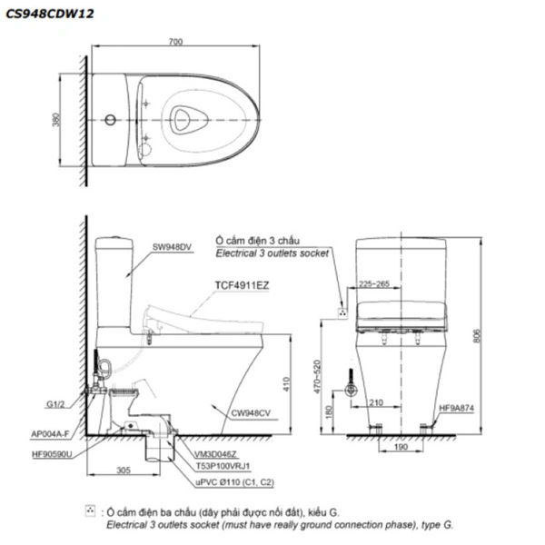 4. Bản vẽ kỹ thuật 2D bồn cầu CS948CDW12