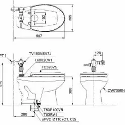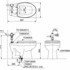 8. Bản vẽ kỹ thuật 2D bồn cầu đặt sàn CW705ENJ/TV150NSV7J/TX802CV1/T53P100VR/T53RV1/TC393VS