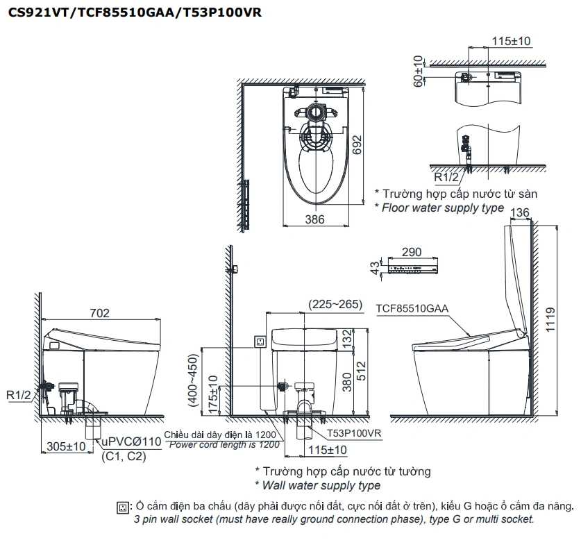 8. Bản vẽ kỹ thuật 2D bồn cầu CS921VT/TCF85510GAA/T53P100VR