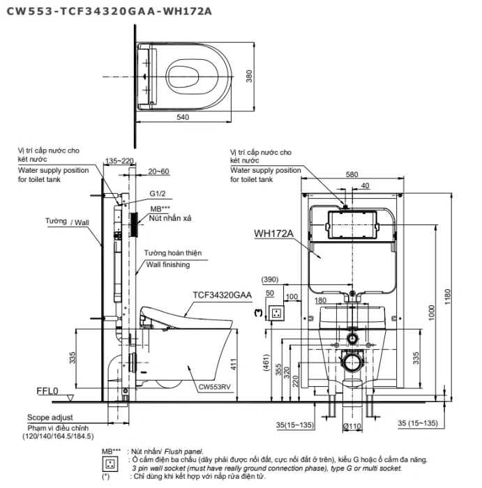 8. Bản vẽ kỹ thuật 2D bồn cầu treo tường CW553/TCF34320GAA/WH172A/MB170P#SS