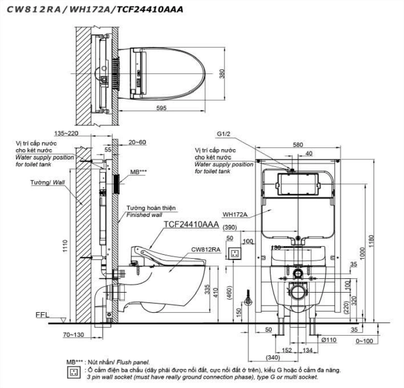 6. Bản vẽ kỹ thuật 2D bồn cầu treo tường CW812RA/WH172A/TCF24410AAA/MB174P#WH