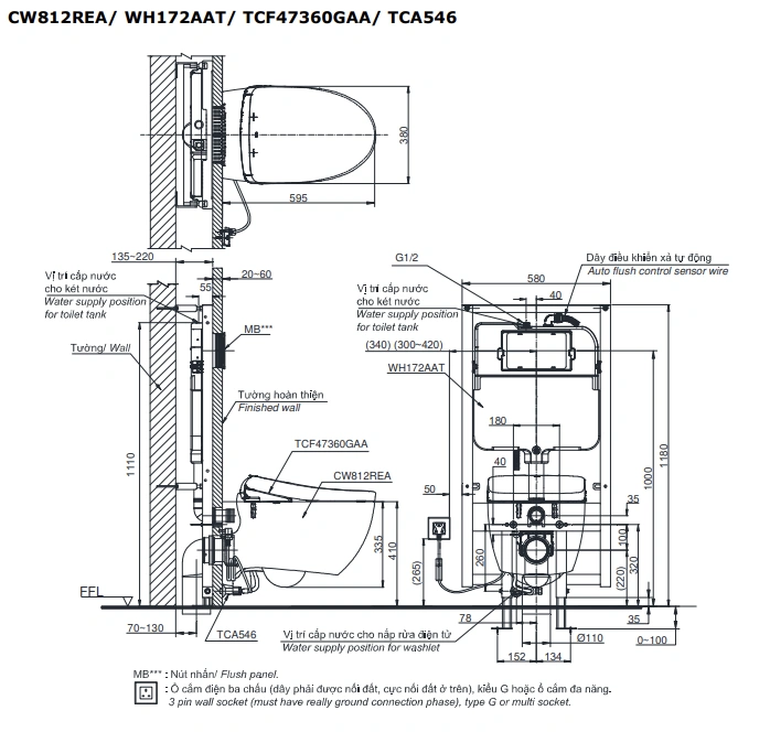 8. Bản vẽ kỹ thuật 2D bồn cầu treo tường CW812REA/TCF47360GAA/WH172AAT/TCA546/MB174P#SS