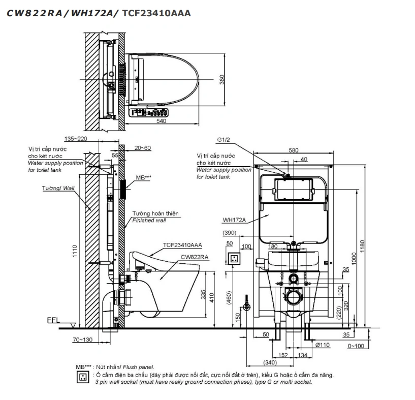6. Bản vẽ kỹ thuật 2D bồn cầu treo tường CW822RA/TCF23410AAA/WH172A/MB170P#SS