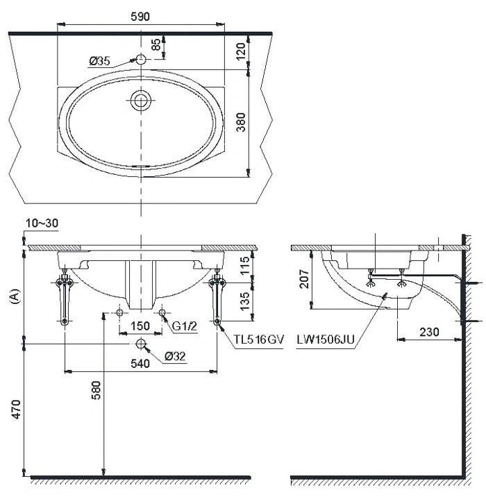 6. Bản vẽ kỹ thuật 2D lavabo âm bàn LW1506V/TL516GV
