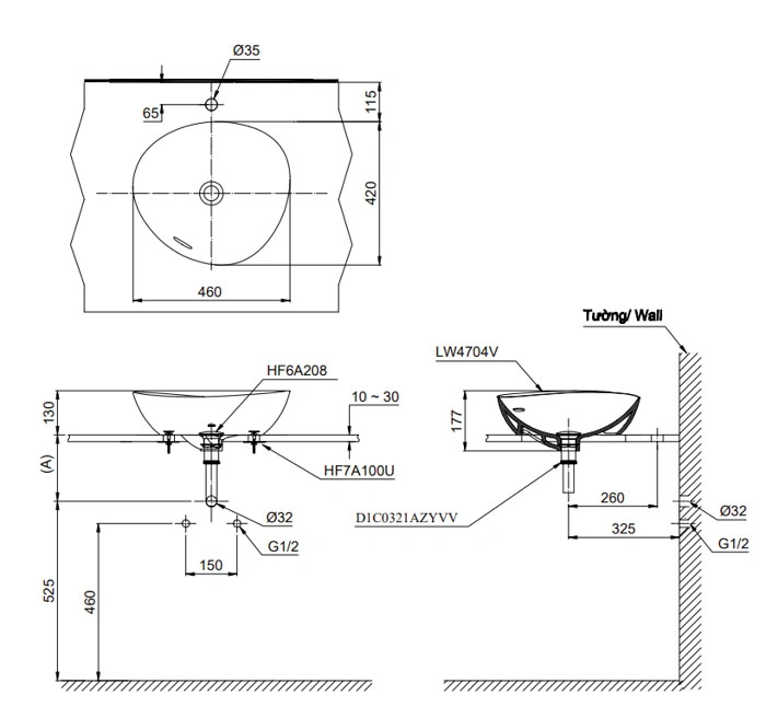 Phụ kiện đi kèm: Thân sứ LW4704V; bộ ốc cố định HF7A100U; bộ thoát thải VM5D419V; nắp pop-up HF6A208; phụ kiện thoát thải D1C0321AZYVV