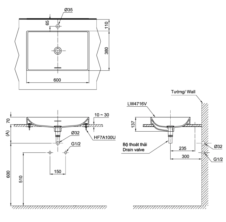 Với kích thước 380 × 600 × 137 mm, lavabo vừa vặn và cân đối, phù hợp khi kết hợp với các loại bàn đá granite, marble hay đá nhân tạo, mang lại sự hài hòa cho tổng thể phòng tắm.