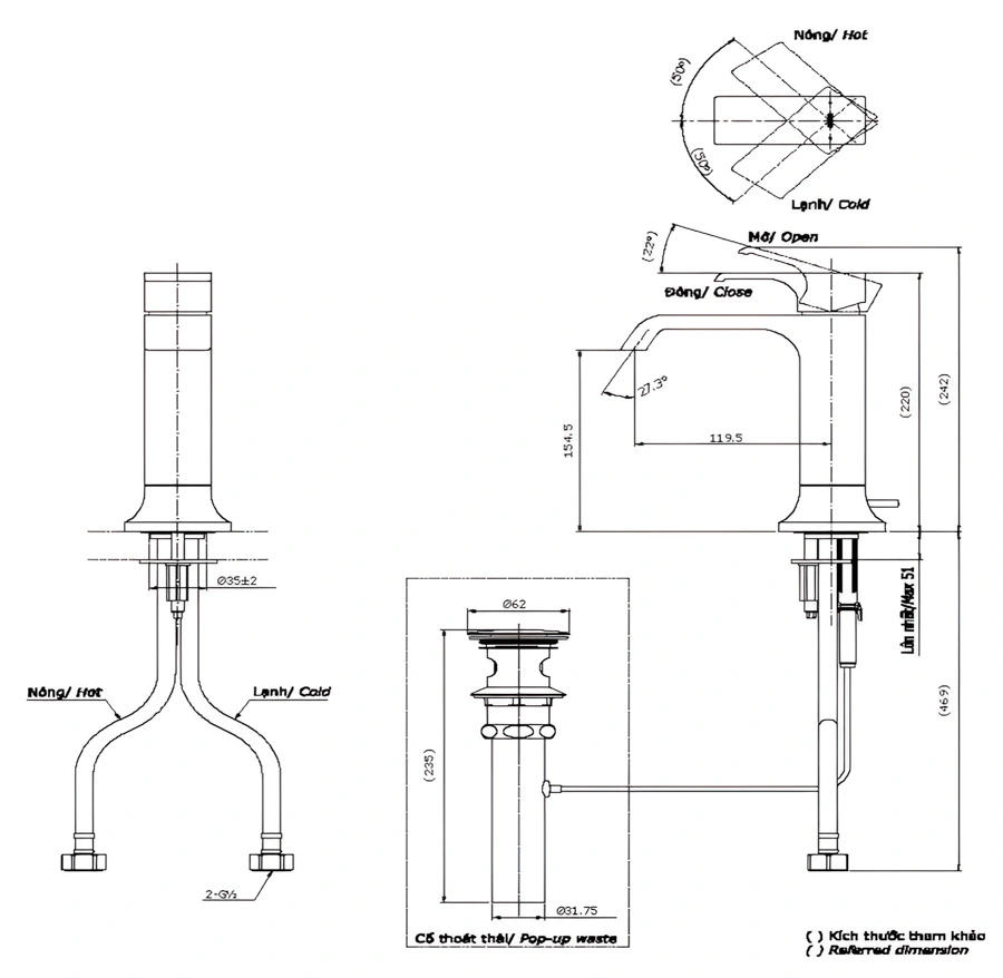 Loại sản phẩm: Vòi lavabo nóng lạnh để bàn (1 lỗ)