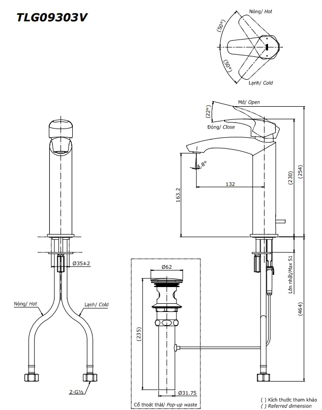6. Bản vẽ kỹ thuật 2D vòi lavabo gật gù nóng lạnh TLG09303V
