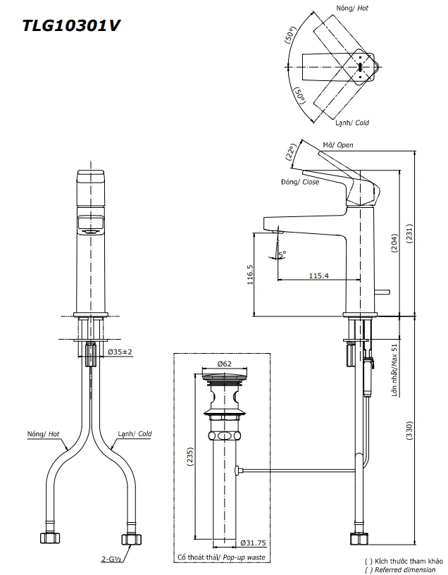 6. Bản vẽ kỹ thuật 2D vòi lavabo gật gù nóng lạnh TLG10301V