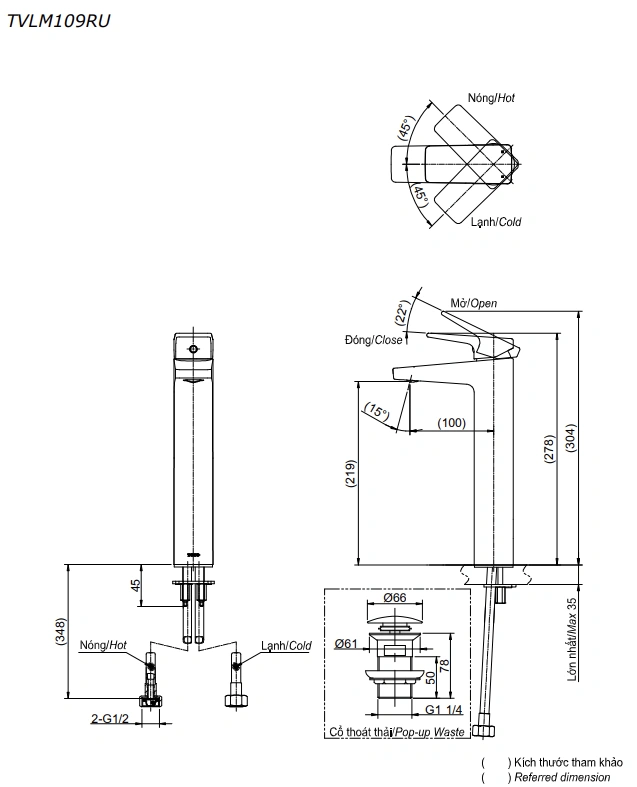 6. Bản vẽ kỹ thuật 2D vòi lavabo gật gù nóng lạnh TVLM109RU