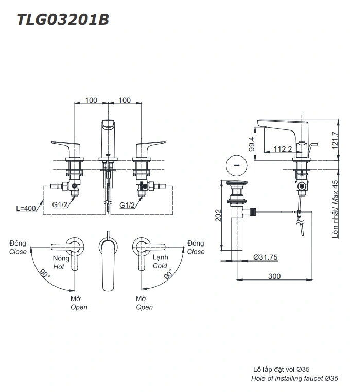 6. Bản vẽ kỹ thuật 2D vòi lavabo tay vặn nóng lạnh TLG03201BB