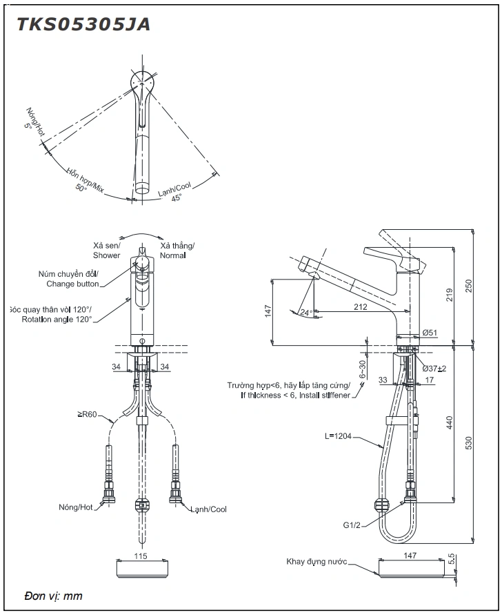 6. Bản vẽ kỹ thuật 2D vòi rửa chén bát nóng lạnh TKS05305JA
