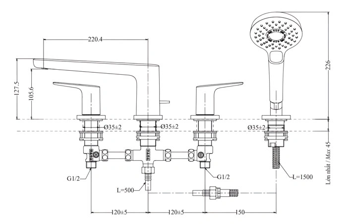 Kiểu lắp đặt: Gắn tường hoặc gắn trực tiếp bồn tắm.